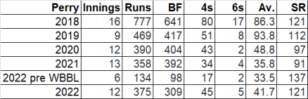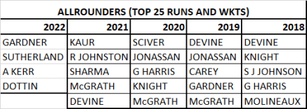 Long term presence Devine had a poor season – a SR of less than 100 (compared to a usual 128+) and just 8 wickets. McGrath just missed out on batting honours (26th) but injury precluded her bowling as much as previous years.