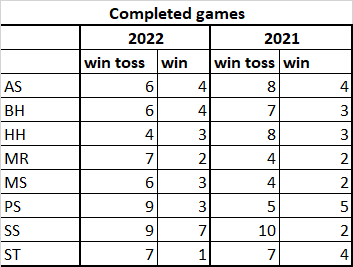 Most interesting is Sixers’ transformation from the least-successful flippers to the best. In contrast, Scorchers went from winning every game when they won they toss last year to losing two-thirds in 2022!