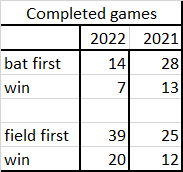 Thus on average teams win half the time whether they bat first or second but behind the headline figures are some big differences by team in terms of strategy and success. For example, in 2022, Renegades won the toss 7x, fielded 7x and lost 5x, whilst Stars won the toss 9x and fielded first every time (3 wins, 3 losses, 3 NR).