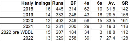 Going into this tournament the T20 careers of both these great players looked like they were in terminal decline when you looked at their WBBL performances. Perry didn’t make the CWG squad but found some form in The Hundred, whereas Healy’s miserable WBBL07 form continued right through until this tournament.