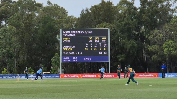 NSW had one change, with Alyssa Healy returning to the Australian squad ahead of the one day matches against India, which brought Georgia Adams back into the Breakers side. Tasmania made no changes to the side from Saturday. NSW won the toss and decided to have a bat, and by over eight they were probably questioning if that was a good call. The overcast conditions played into Tasmania’s hands and an early swing was used devastatingly by Callie Wilson who picked off NSW’s top order batters. First Katie Mack who pushed a delivery high into the gloves of keeper Lizelle Lee, then Wilson trapped Anika Learoyd a few balls later on the pads. Tahlia Wilson was her namesake’s next wicket, when she edged a ball to the waiting keeper. Taswegian Kathryn Bryce joined the party in the next over when Claire Moore followed the ball round with her bat before it too went to the keeper. Georgia Adams and Maitlan Brown worked to steady the NSW innings, but they too were sent back to the benches with NSW having only 88 runs on the board.